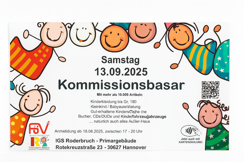 Am Samstag, den 13. September 2025, findet von 12:00 bis 15:00 Uhr wieder unser großer Kommissionsbasar im Primargebäude der IGS Roderbruch statt.